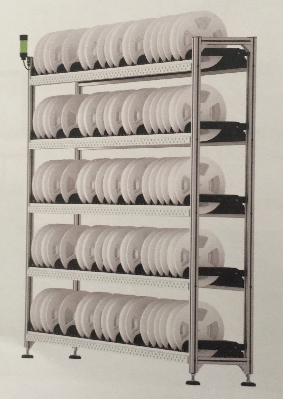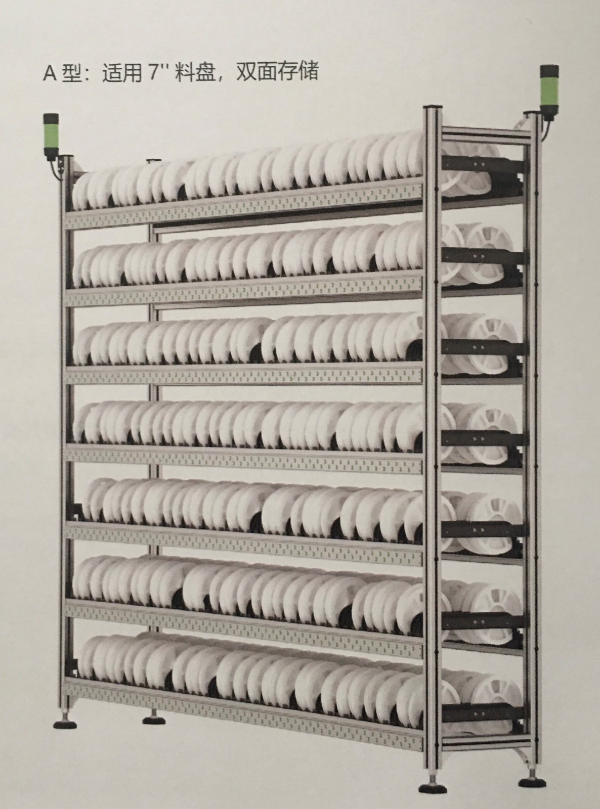 • A型智能料架為標準7寸料盤存儲料架,雙面存放,1400個儲位,單色、多色可選,最大可支持7色。